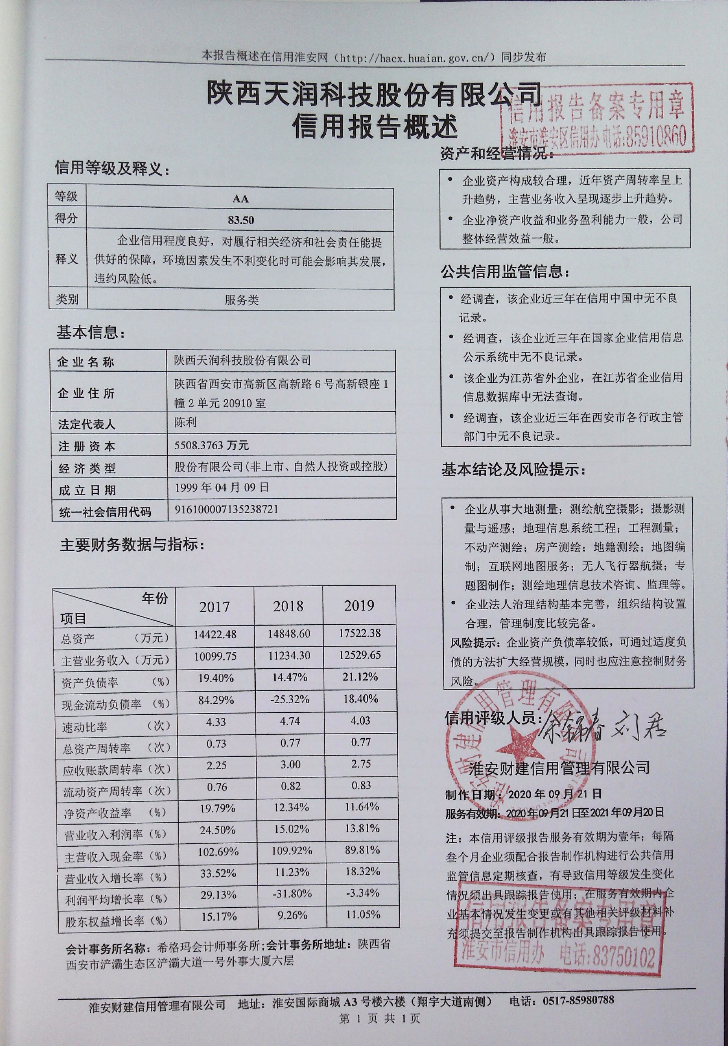 陕西天润科技股份有限公司信用报告公示页